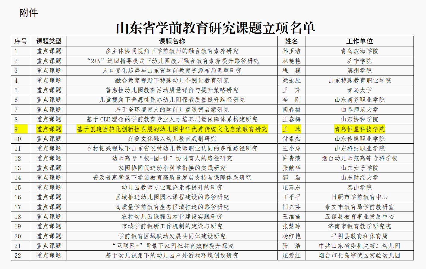 近日,山东省学前教育中心对各市教育(教体)局、高等学校推荐的478项课题进行了评审,确定23项重点课题、177项一般课题。9月21日,2022年度山东省学前教育研究课题立项名单公布。我校教育学院王冰院长主持的《基于创造性转化创新性发展的幼儿园中华优秀文化启蒙教育研究》获准立项重点课题。