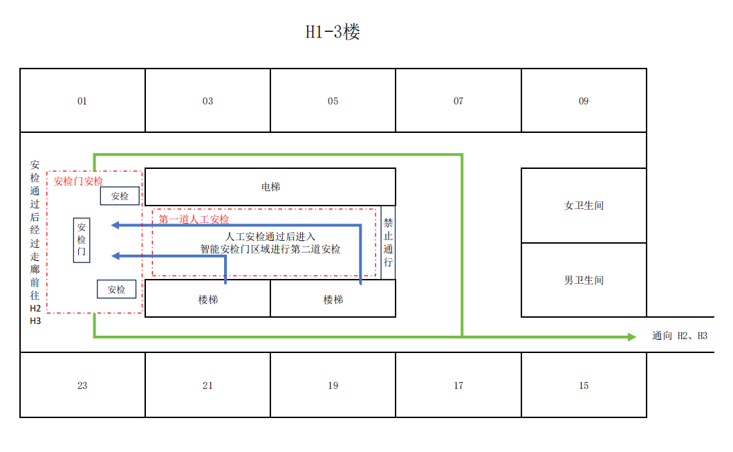 一、本次考试按照山东省教育招生考试院的要求,严格执行“2+1安检”制度,即两次人工安检+一次智能安检。本次考试封闭区为H1、H2、H3教学楼的三、五、六层,考生在进入封闭区入口(即H1教学楼三层的电梯厅南侧出口)和考场入口时需接受工作人员手持金属探测器进行人工安检,并在第一次人工安检后接受智能安检门(封闭区入口)安检。考生在接受工作人员的身份、违禁品查验后于封闭区内等待,并在规定的时间(上午8:00开始,下午2:00开始)根据考务人员的指令进入封闭区,考试开始后(上午9:00,下午3:00),迟到考生将禁止入场。考试当天,封闭区域入口见下图。