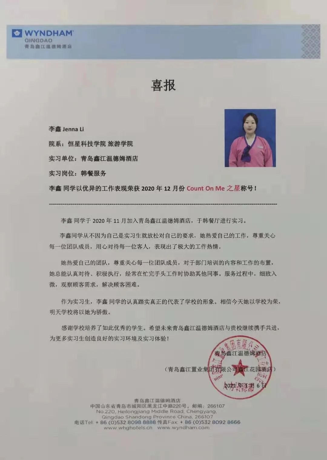 感谢学校培养了如此优秀的学生,希望未来青岛鑫江温姆酒店与贵校继续携手共进,为更多实习生创造良好的实习环境及实习体验!