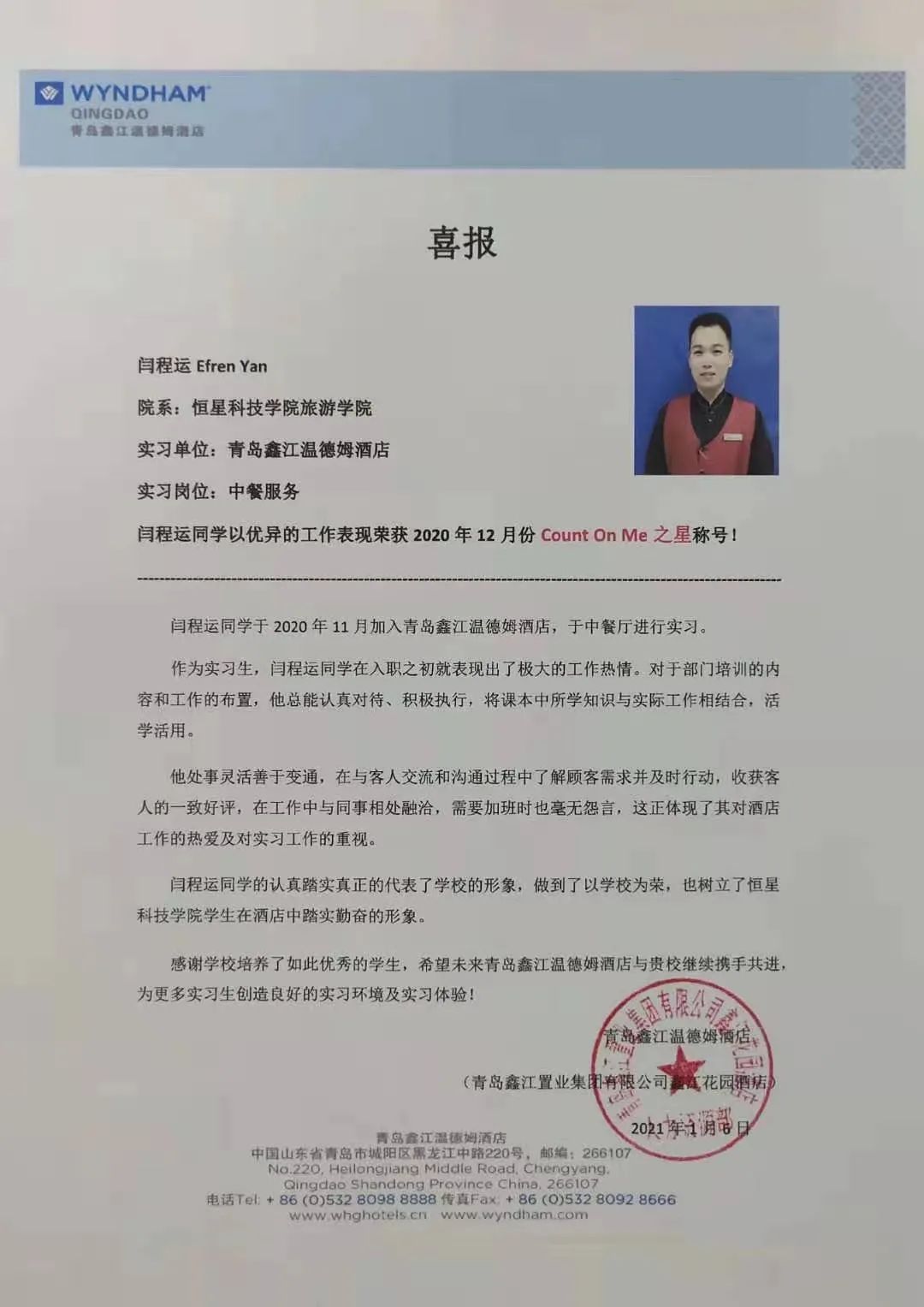 闫程运同学的认真踏实真正的代表了学校的形象,做到了以学校为荣,也树立了青岛恒星科技学院学生在酒店中踏实勤奋的形象。
