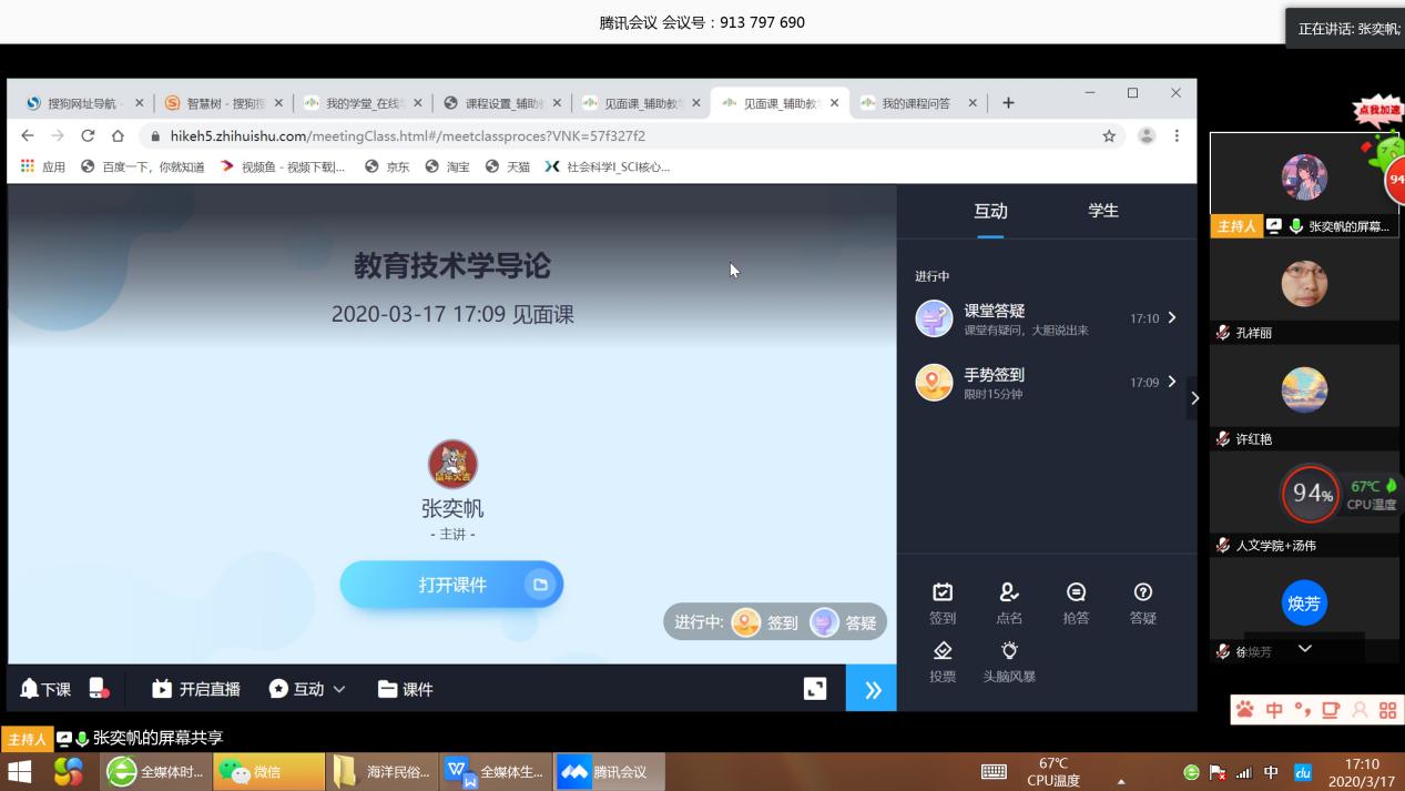 “停课不停学”!为积极响应党和国家号召,落实好学校线上教学工作任务,使教师更加娴熟使用线上授课软件,提高教师线上授课能力和学生的线上学习效率,2020年3月17日下午,人文学院和马克思主义学院的教师,在教学院长孔祥丽的带领下,由教育技术学1901班专任教师张奕帆主讲,两个学院的教师共同学习智慧树线上教学,相互交流智慧树线上授课软件的使用,探讨在使用中遇到的问题及解决的方案。