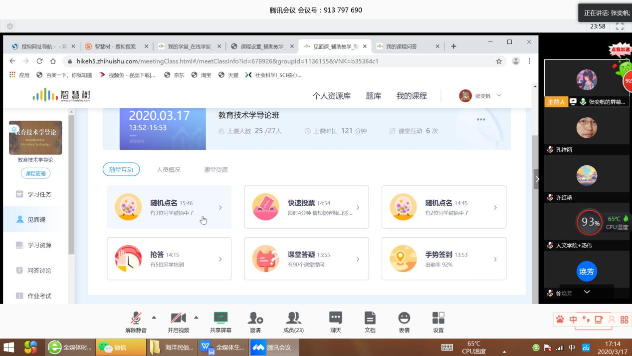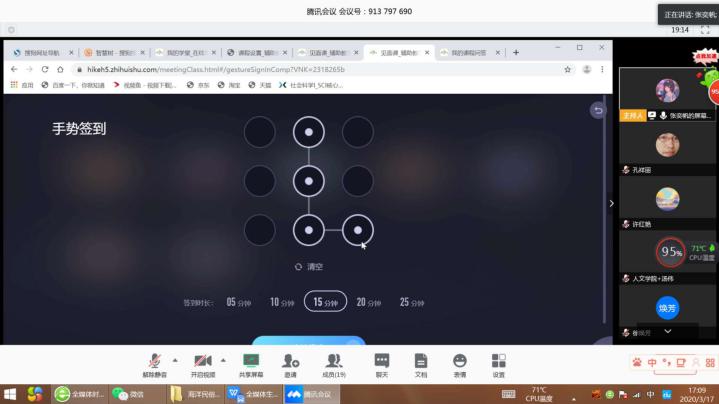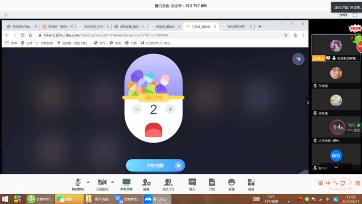 张奕帆老师系统的介绍了“智慧树”授课软件的使用方法,如:怎样开课、学生如何签到、老师如何查看学生上课情况,并分享了软件中的随机点名、抢答、头脑风暴等一些活跃课堂氛围的小应用。张老师还结合自己一个月的智慧树线上教学实践,分享了线上教学的一些经验,线上教学彰显了教师个人魅力在的重要性,关键是“授课教师要用心”,“以朋友的身份与学生相处”,“教学内容与日常生活相结合,从而可以提升学生学习兴趣”等可贵经验。