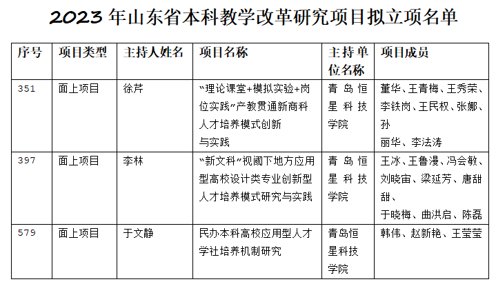 2023年12月29日,山东省教育厅公示了2023年山东省本科教学改革研究项目拟立项名单,我校共获批面上项目三项,项目名单如下。