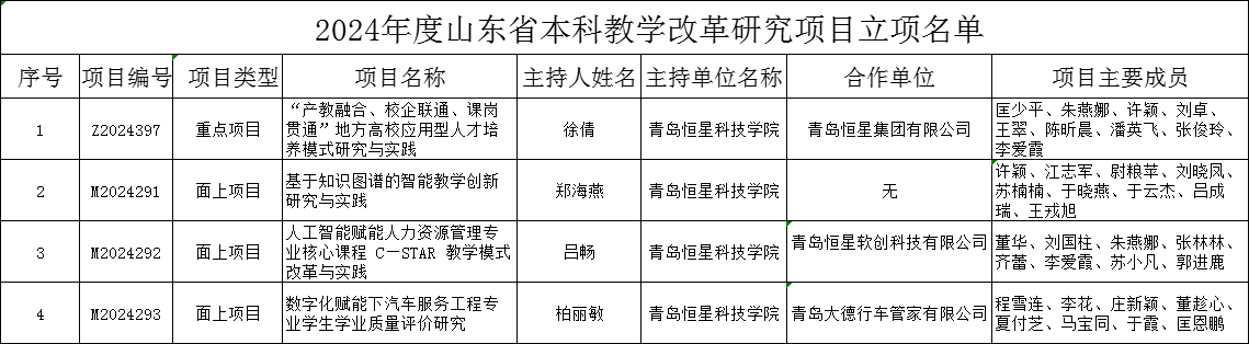 近日,山东省教育厅公布了2024年本科教学改革研究项目立项名单,我校申报的1项重点项目、3项面上项目全部获批。另外,2024年我校申报的山东省职业教育教学改革研究项目立项1项,立项率100%。