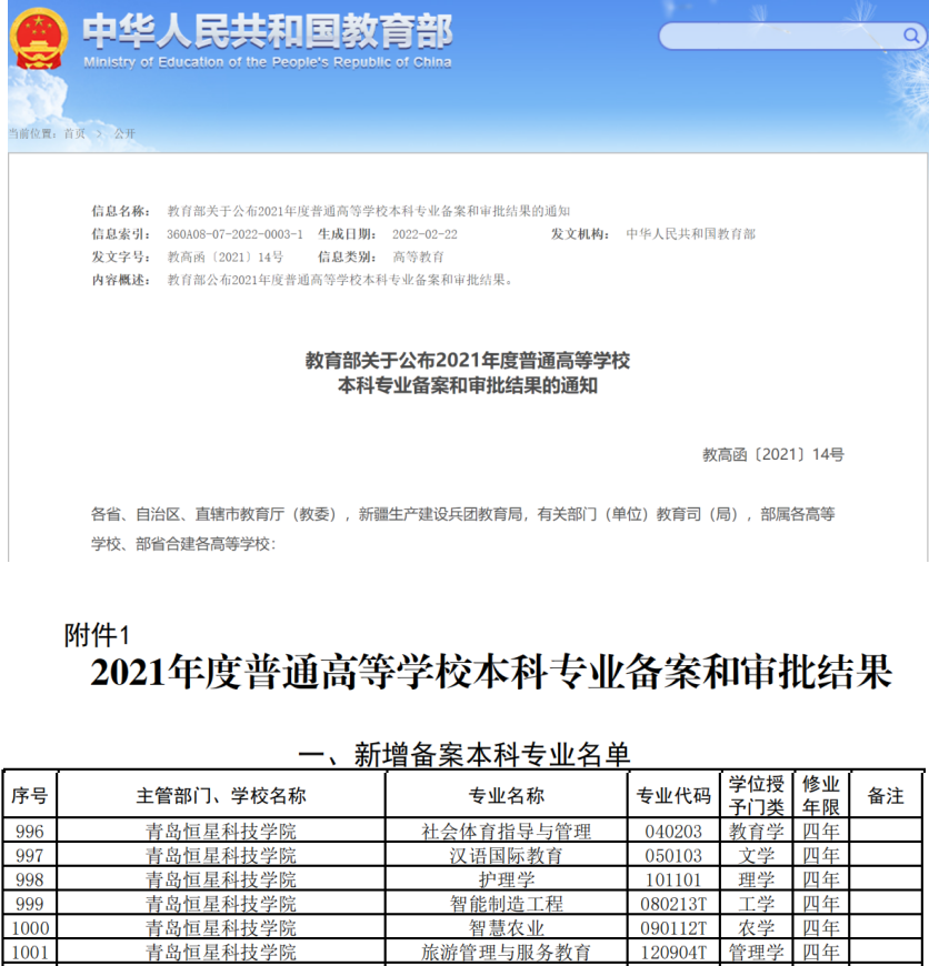 近日,教育部公发了《教育部关于公布2021年度普通高等学校本科专业备案和审批结果的通知》(教高函〔2021〕14号),青岛恒星科技学院申报的社会体育指导与管理、汉语国际教育、护理学、智能制造工程、智慧农业、旅游管理与服务教育6个本科专业获批增设。至此,我校2022年本科招生专业总数达40个。